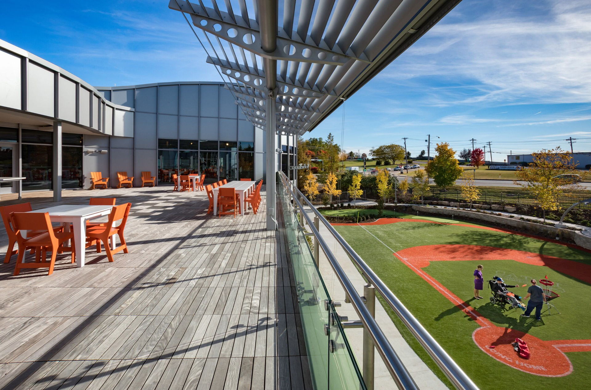 Our building – the only pediatric specialty post-acute care hospital in Missouri – now features a variety of play-oriented spaces, including: an accessible rock climbing wall, a putting green, indoor and outdoor playgrounds, a barrier-free sports field, and more.