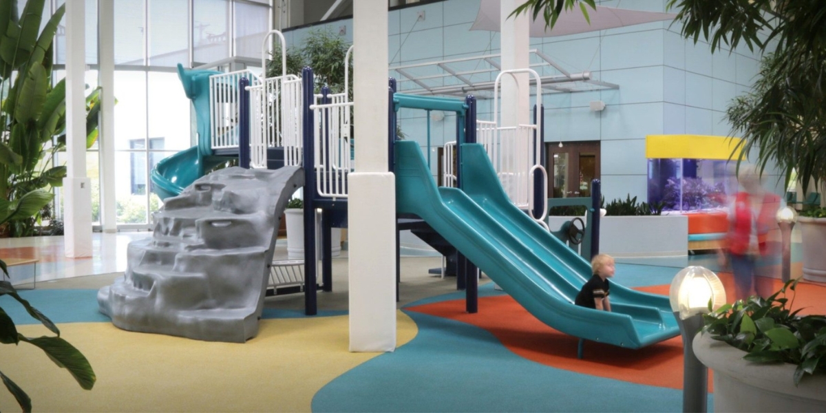 This December marks two decades in our colorful, hope-inspiring building in Maryland Heights, Missouri. During the design process , Ranken Jordan’s leadership team, staff members, patients and families met with architect Steve Hunsicker and his team to compile our ideas of what Ranken Jordan Pediatric Bridge Hospital should and could look like. We envisioned a functional, interactive village-like setting, in which every inch of the building would foster inclusion and play – a crucial component of recovery.